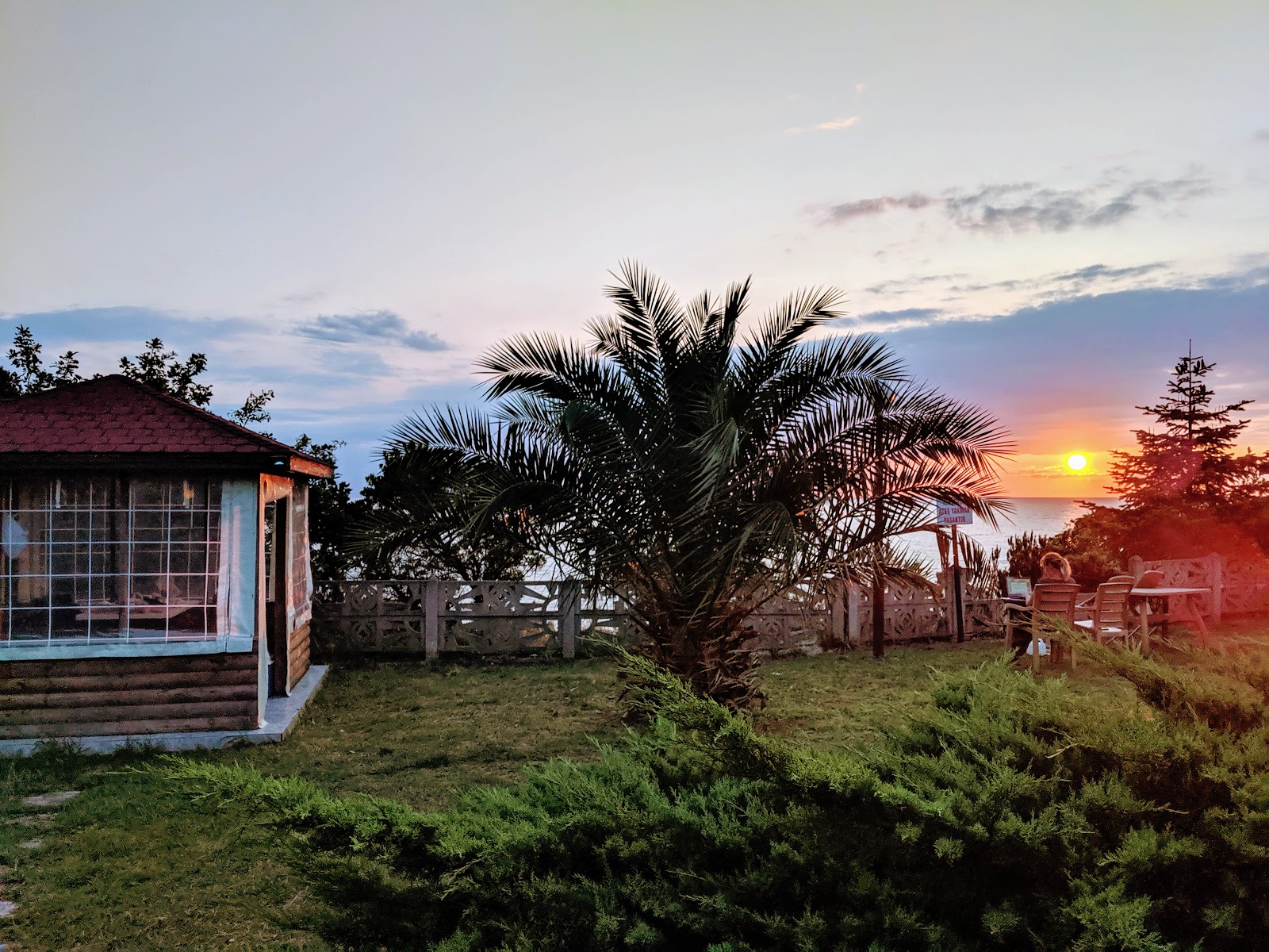 Unsere Fahrt durchs Grüne endet übrigens mit Wiedersehensfreude, denn wir sehen unser Schwarzes Meer wieder! Doch die Küste stellt sich uns komplett anders dar als in Rumänien oder Bulgarien. Eine vierspurige Autobahn zieht sich die gesamte Küste entlang, die noch dazu komplett bebaut ist. Einen Platz zu finden ist hier nicht so einfach. Wir finden letztlich eine Stelle etwas abseits der großen Straße auf einer Landzunge, doch da dies tatsächlich der einzige Platz im näheren Umkreis ist, an dem der Strand nicht direkt hinter der Leitplanke liegt, wird er offensichtlich häufig genutzt und ist dementsprechend vermüllt. Ernüchtert entscheiden wir uns für einen kleinen Campingplatz, der zwar für unsere Verhältnisse recht teuer ist, dafür aber auch das ein oder andere Schmankerl zu bieten hat. So stehen auf der Wiese hoch über dem Meer einige Pavillons, die man nutzen kann und die sogar über Strom und elektrisches Licht verfügen. Ein Bild wie von einem Luxus-Strandurlaub, auch wenn der Platz bei näherem Hinsehen seine besten Jahre eindeutig hinter sich hat. `Unser´ Pavillon zumindest steht noch ganz gut da und es macht Spaß, sich hier häuslich einzurichten. Wir kochen drinnen und essen an einem richtigen Tisch. Sogar unsere Tischdecke legen wir auf und stellen einen Zweig vom Oleander nebenan in die Vase. Aus unserer Kühlbox wird dank Steckdose ein richtiger Kühlschrank und mit den Gänsen, die schnatternd vorbeischauen, haben wir nun sogar Haustiere.